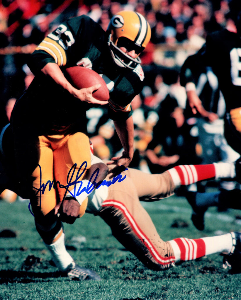 An 8x10 hand signed photo of former Green Bay Packer legend JIM GRABOWSKI. The signatures are in blue sharpie. GRABOWSKI was a member of the Super Bowl I & II championship teams. This would make a great addition to any Packer collection. This photo was signed at a public signing in our store. This item is guaranteed to be 100% authentic and will include a COA with matching serial numbered holograms.