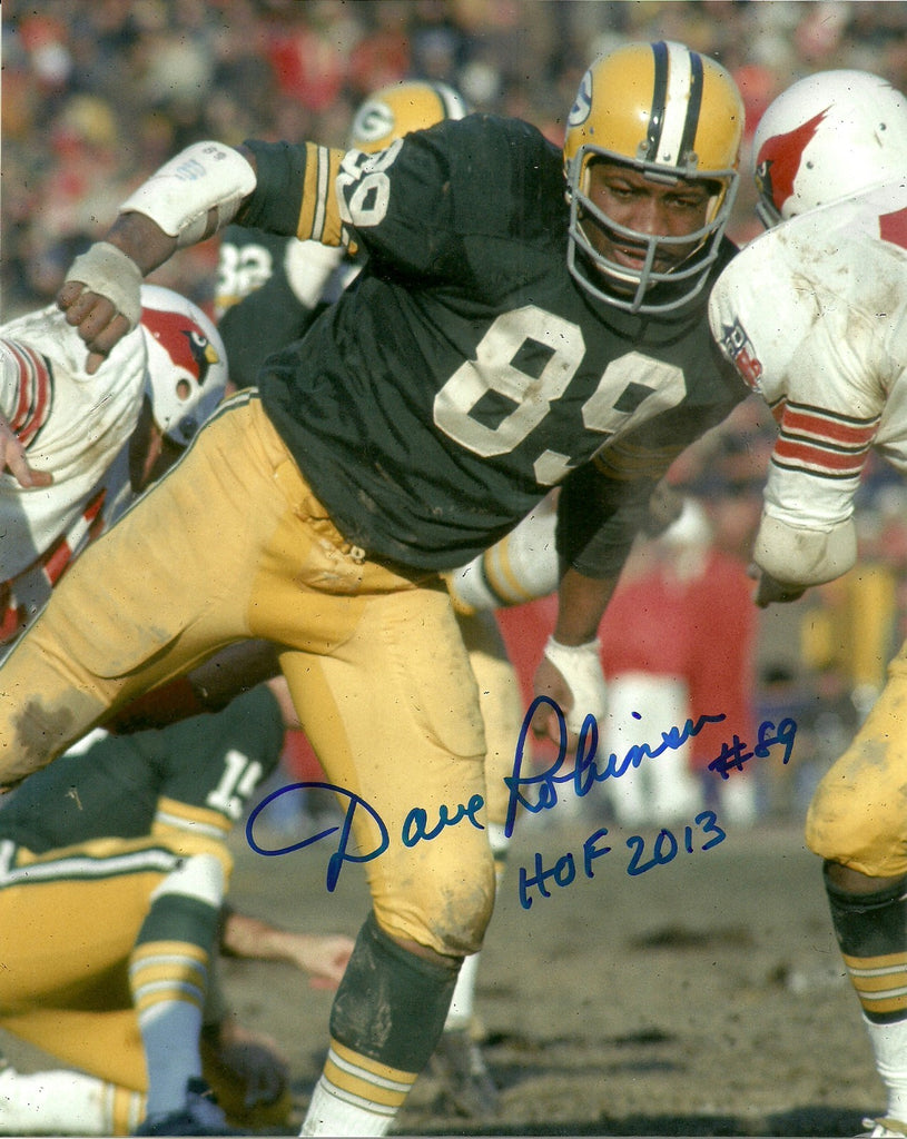 An 8x10 hand signed photo of former Green Bay Packer Hall of Famer DAVE ROBINSON. The signature is in Blue sharpie with the inscription HOF 2013. ROBINSON was a member of the Super Bowl I & II championship teams. This would make a great addition to any Packer collection. This photo was signed at a public signing with us. This item is guaranteed to be 100% authentic and will include a COA with matching serial numbered holograms.
