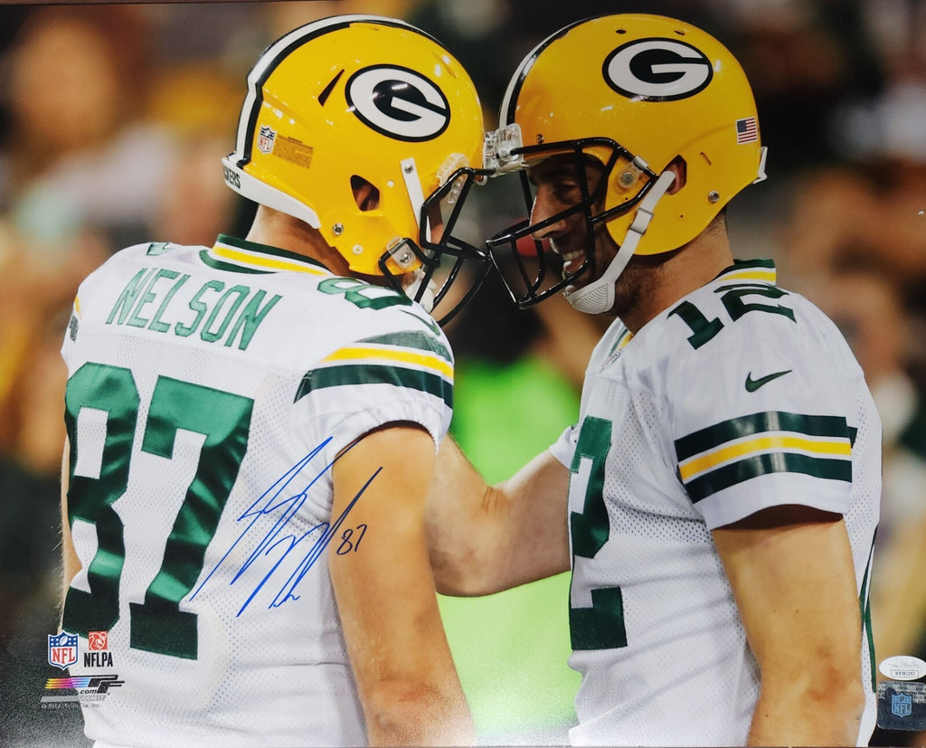 A 16x20 hand signed photo of Green Bay Packers Wide Receiver JORDY NELSON. The signature is in Blue Sharpie. This photo was signed at a private signing with us. This item is guaranteed to be 100% authentic and will include a COA from JSA authentication.
