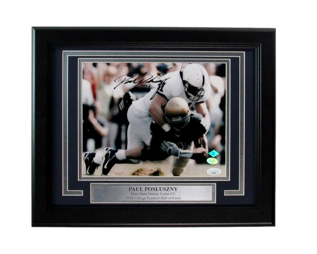 Paul Posluszny Signed/Autographed 8x10 Photo Penn State Nittany Lions Framed. The outside frame dimensions are 16.25 inches x 13.25 inches. This photo is authenticated by JSA and includes their tamper-proof hologram sticker and certificate of authenticity.