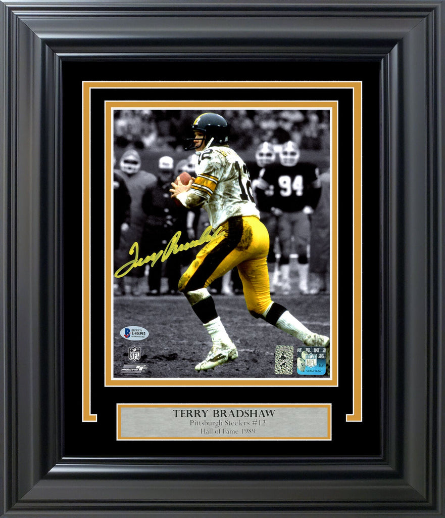 This is a Framed 8x10 Photo, approximately 15x18 with the frame, that has been hand signed by Terry Bradshaw. This item has been certified authentic by Beckett Authentication (BAS) and comes with their tamper-proof sticker and matching certificate of authenticity.