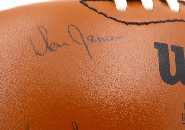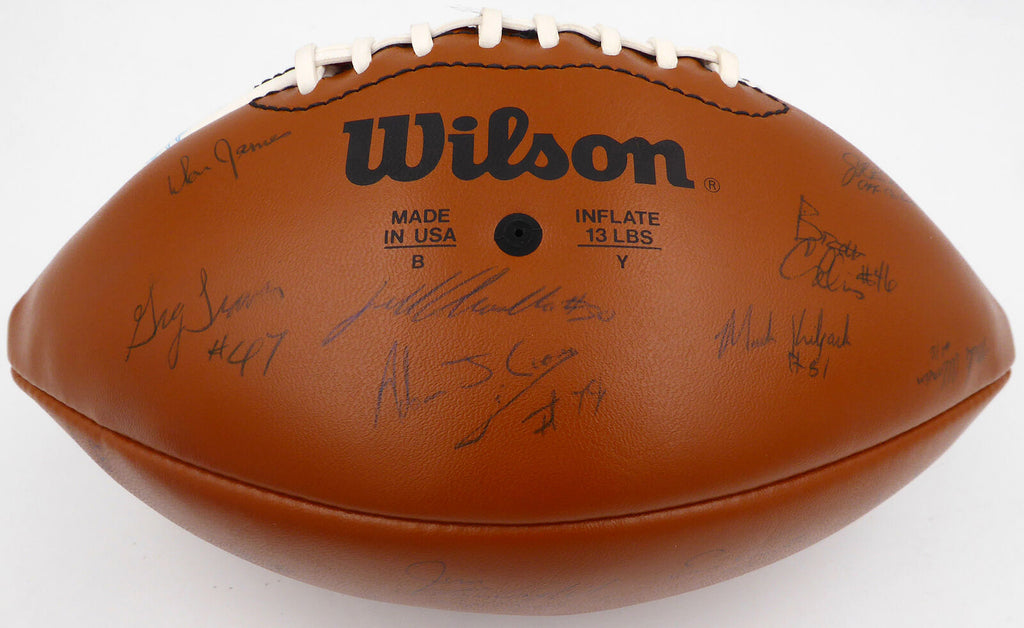 This is a Wilson Football that has been hand signed by 39 Players and coaches from the 1989 UW Huskies. Signatures include Don James, Greg Lewis, Jim Lambright, Cary Conklin, James Compton, Andre Riley, Mark Degross, Art Hunter, Jeff Chandler, Dennis Brown, James Clifford and Marc Jones. This item is guaranteed to pass any third party authentication company including Beckett, PSA/DNA, & JSA authentication.