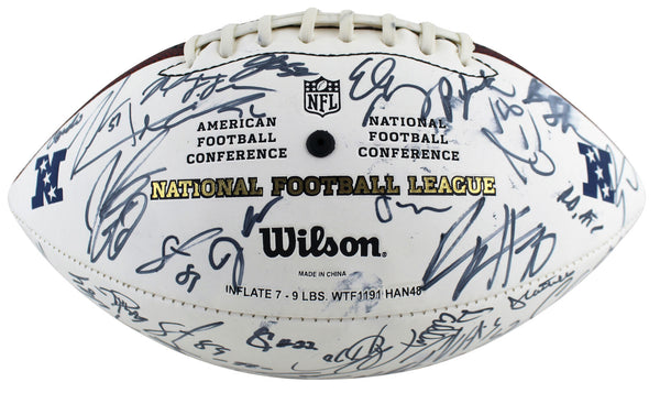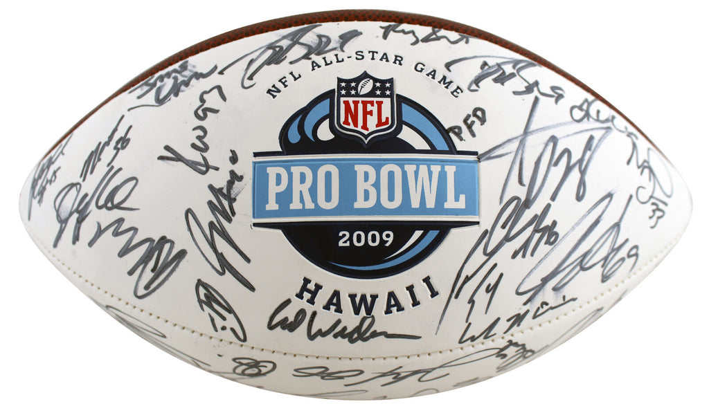 This Autographed 2009 Pro Bowl White Panel Logo Football has been Personally Signed by Notable Signatures Include: Drew Brees (x2), Eli Manning, Adrian Peterson, Patrick Willis, Clinton Portis, Roddy White, Chris Cooley, Kevin Williams (x2), Jared Allen, Wes Welker, Jason Witten, Ronde Barber, Demarcus Ware, Walter Jones & more!. This item is 100% Authentic to include a Certificate of Authenticity (COA) / hologram by JSA. The authenticity can be verified on JSA website.
