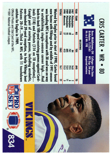 Cris Carter signed Minnesota Vikings 1991 Pro Set football trading card #834. Item comes with a Schwartz Sports Memorabilia tamper-proof numbered hologram (on back of physical card) and Certificate of Authenticity which can be verified online.