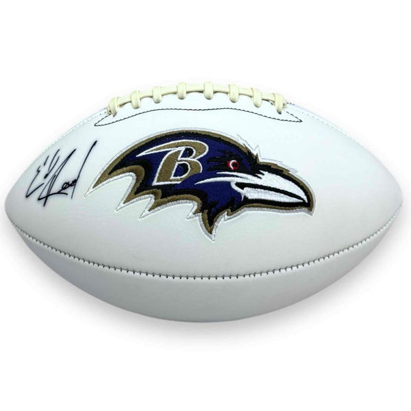 ATHLETE: Ed Reed ITEM: Baltimore Ravens Logo Football AUTHENTICATION: This item comes with a Beckett serial #'ed sticker affixed to the item. To ensure authenticity, the hologram can be reviewed online. This process helps to ensure that the product purchased is authentic and eliminates any possibility of duplication or fraud. You will receive the exact ball pictured.