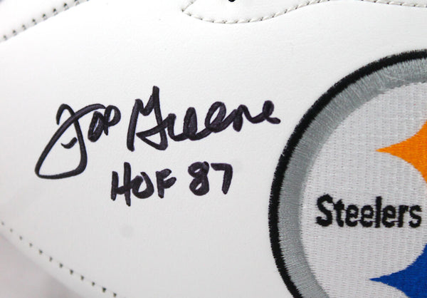 Joe Greene Pittsburgh Steelers Logo Football w/HOF-Beckett W Hologram *Black Joe Greene Autographed Pittsburgh Steelers Logo Football With HOF Beckett Witnessed Authentication This is a Hand Autographed Football of Joe Greene of The Pittsburgh Steelers. This is a Pittsburgh Steelers Logo Football. This item has a Beckett Witnessed Authentication, which Comes with a Beckett #'ed hologram and a QR code for verification. You can view this item on the Beckett website and it shows when and where the item was signed. It was signed either at a public autograph appearance or a Private Signing. This is a stock photo of the item. Although you may not receive this exact item, the item you receive is virtually identical and brand new in great shape.