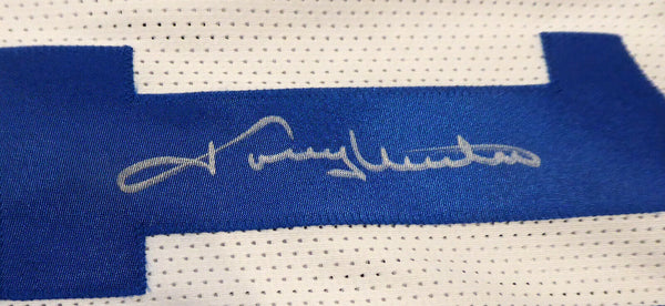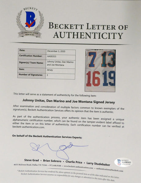 This is a White Custom QB of the Century Jersey that has been hand signed by Johnny Unitas, Joe Montana & Dan Marino. It has been authenticated by Beckett BAS and comes with their sticker and matching full page certificate of authenticity.A This is a custom jersey with no major brand.A It has sewn in name and numbers, and is approximately XL.