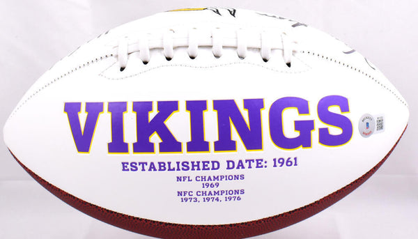 Warren Moon Autographed Minnesota Vikings Logo Football w/HOF- Beckett W Hologram *Black This is a Hand Autographed Logo Football of Warren Moon of The Minnesota Vikings. This item has a Beckett Witnessed Authentication, which Comes with a Beckett #'ed hologram and a QR code for verification. You can view this item on the Beckett website and it shows when and where the item was signed. It was signed either at a public autograph appearance or a Private Signing. This is a stock photo of the item. Although you may not receive this exact item, the item you receive is virtually identical and brand new in great shape.