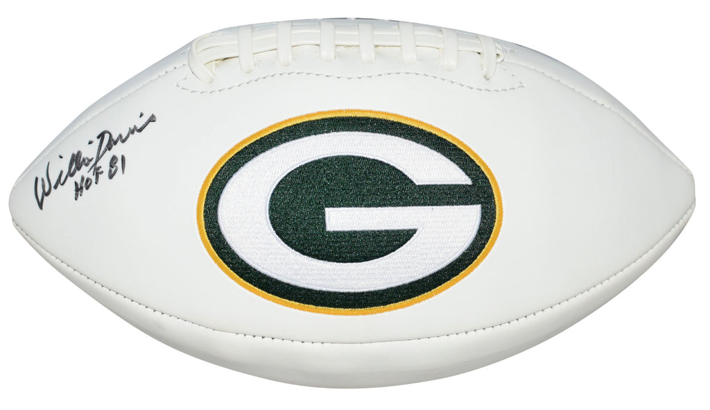 Willie Davis, former Hall of Fame defensive end for the Green Bay Packers, has hand signed this Packers white panel logo football at a private signing. He included the inscription "HOF 81". This item comes with a certificate of authenticity (COA) from JSA - James Spence Authentication and was signed in the presence of one of their representatives. You will receive a serial-numbered COA along with a matching serial-numbered sticker on the ball. The authenticity can be verified online by entering the serial number.Item pictured may not be the exact item you will receive. It will be similar quality, and we guarantee your satisfaction.