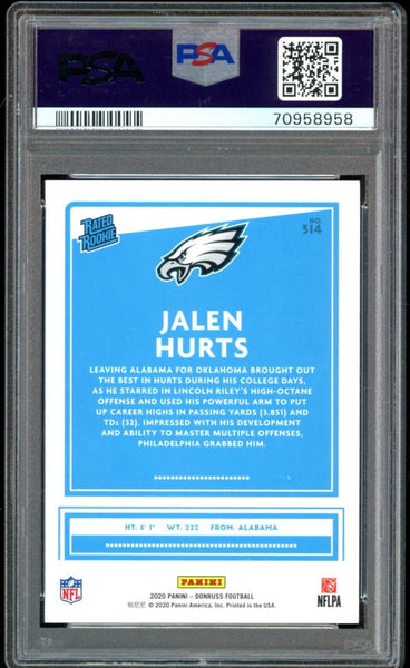 2020 Donruss Rated Rookie #314 Jalen Hurts On Card PSA 10/10 Auto GEM MINT