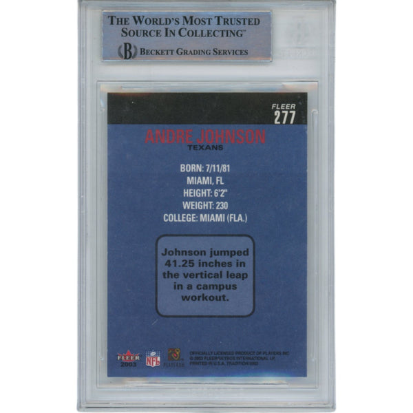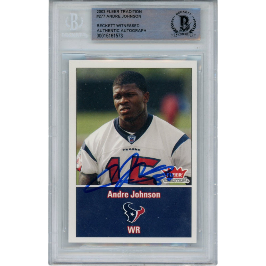 The number in the listing title is just an inventory sku for our records and is not the authentication number. The item pictured is the exact item you will receive, please see photos for condition. This is an Houston Texans Fleer Tradition #277 Slabbed Trading Card that was personally autographed by Andre Johnson. Includes a certificate of authenticity from Beckett Authentication Services (BAS) and Denver Autographs.