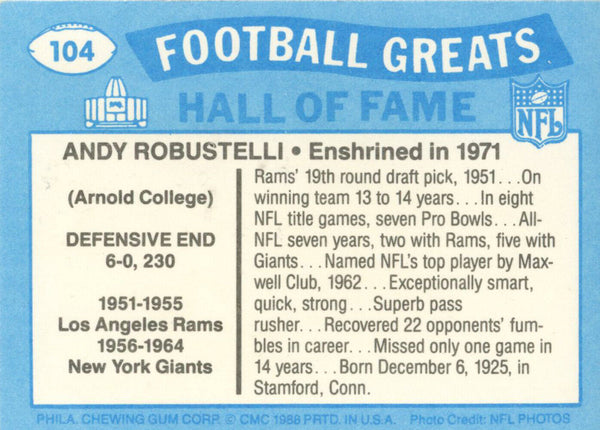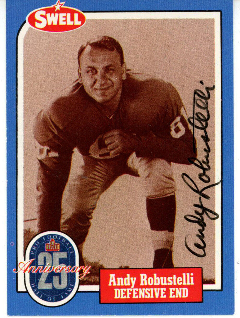 Andy Robustelli Autographed/Signed New York Giants 1988 Swell HOF Card 43161 The number in the listing title is just an inventory sku for our records and is not the authentication number. The item pictured is a stock photo unless otherwise noted. This is a 1988 Swell Pro Football Hall Of Fame Anniversary card that has been personally signed by Hall of Famer Andy Robustelli. This is the actual card you will receive, please see scan for condition. This item includes a certificate of authenticity from Denver Autographs.