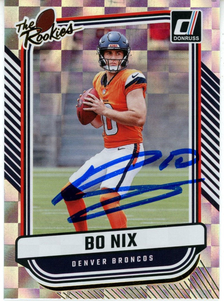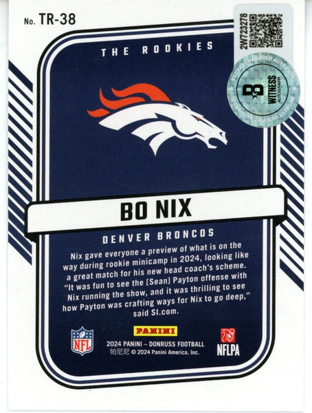 The number in the listing title is just an inventory sku for our records and is not the authentication number. The item pictured is the exact item you will receive, please see photos for condition. This is a Denver Broncos 2024 Donruss #TR-38 Trading Card Trading Card that was personally autographed by Bo Nix. Includes a certificate of authenticity from Beckett Authentication Services (BAS) and Denver Autographs.