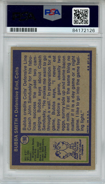 Bubba Smith Autographed/Signed 1972 Topps #190 Trading Card PSA Slab 43698 The number in the listing title is just an inventory sku for our records and is not the authentication number. This is the exact item that you will receive so please see pictures for condition. This is a trading card that was personally autographed by Bubba Smith. This has been professionally slabbed by Professional Authentication Services (PSA) and includes a certificate of authenticity from Denver Autographs.