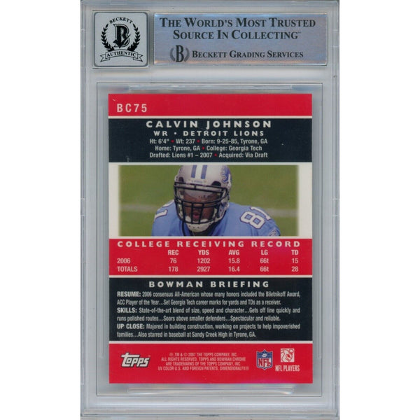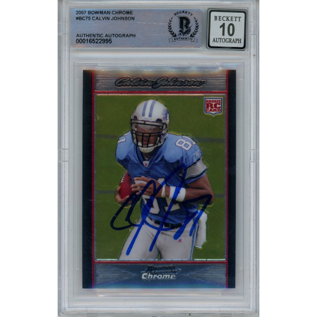 The number in the listing title is just an inventory sku for our records and is not the authentication number. The item pictured is the exact item you will receive, please see photos for condition. This is a Detroit Lions 2007 Bowman Chrome #BC75 Slabbed Trading Card with a Grade 10 Autograph that was personally autographed by Calvin Johnson. Includes a certificate of authenticity from Beckett Authentication Services (BAS) and Denver Autographs.FREE SHIPPING within the USA on orders over $10!