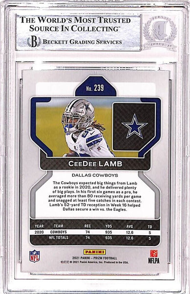 CeeDee Lamb Autographed 2021 Prizm #239 Trading Card Beckett 39073 The number in the listing title is just an inventory sku for our records and is not the authentication number. The item pictured is a stock photo unless otherwise noted. This is a slabbed Dallas Cowboys Prizm #239 Trading Card that was personally autographed by CeeDee Lamb. Includes a certificate of authenticity from Beckett Authentication Services (BAS) and Denver Autographs.