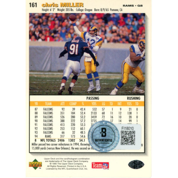 The number in the listing title is just an inventory sku for our records and is not the authentication number. The item pictured is the exact item you will receive, please see photos for condition. This is a Saint Louis Rams 1994 Upper Deck #161 Trading Card that was personally autographed by Chris Miller. Includes a certificate of authenticity from Beckett Authentication Services (BAS) and Denver Autographs. FREE SHIPPING within the USA on orders over $99!
