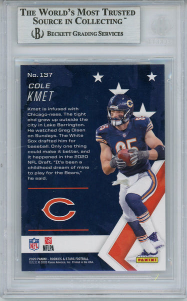 Cole Kmet Autographed 2020 Rookies & Stars #137 Rookie Card BAS Slab 33069 The number in the listing title is just an inventory sku for our records and is not the authentication number. This is a 2020 Rookies and Stars #137 rookie trading card that was personally autographed by Cole Kmet. This has been professionally slabbed by Beckett Authentication Services (BAS) and includes a certificate of authenticity from Denver Autographs.