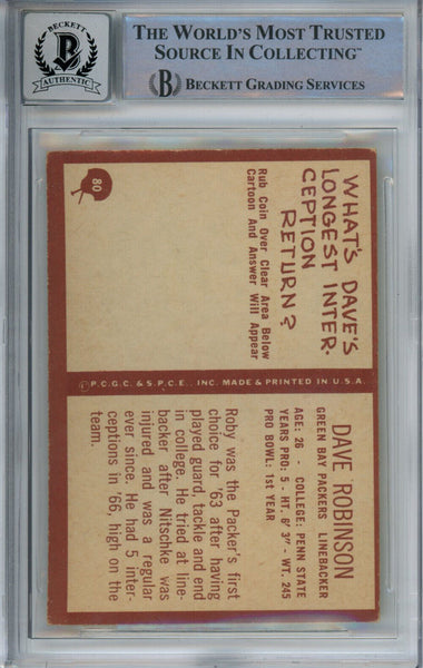 Dave Robinson Signed 1967 Philadelphia #80 Rookie Card Beckett 10 Slab 38647 The number in the listing title is just an inventory sku for our records and is not the authentication number. This is the exact item that you will receive so please see pictures for condition. This is a trading card that was personally autographed by Dave Robinson. This has been professionally slabbed by Beckett Authentication Services (BAS) and includes a certificate of authenticity from Denver Autographs.
