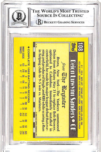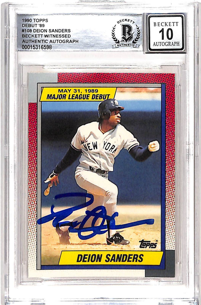 Deion Sanders Signed 1989 Topps Debut #108 Card 10 Auto Beckett 42659 The number in the listing title is just an inventory sku for our records and is not the authentication number. The item pictured is a stock photo unless otherwise noted. This is a slabbed 1989 Topps Debut #108 Trading Card with a Grade 10 Autograph that was personally autographed by Deion Sanders. Includes a certificate of authenticity from Beckett Authentication Services (BAS) and Denver Autographs.