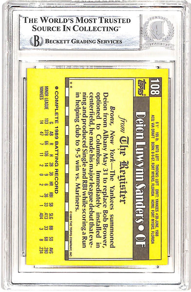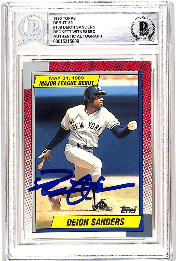 Deion Sanders Signed 1989 Topps Debut #108 Trading Card Beckett 42655 The number in the listing title is just an inventory sku for our records and is not the authentication number. The item pictured is a stock photo unless otherwise noted. This is a slabbed 1989 Topps Debut #108 Trading Card that was personally autographed by Deion Sanders. Includes a certificate of authenticity from Beckett Authentication Services (BAS) and Denver Autographs.
