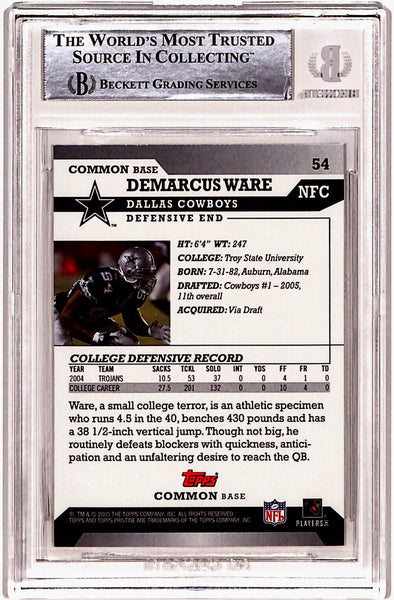 Demarcus Ware Autographed 2005 Pristine #54 Rookie Card Beckett Slab 43451 The number in the listing title is just an inventory sku for our records and is not the authentication number. The item pictured is a stock photo unless otherwise noted. This is a trading card that was personally autographed by Demarcus Ware. This has been professional slabbed by Beckett Authentication Services (BAS) and includes a certificate of authenticity from Denver Autographs.