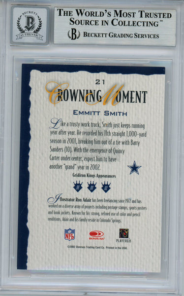 Emmitt Smith Signed 2002 Gridiron Kings #21 Trading Card Beckett 10 Slab 35085 The number in the listing title is just an inventory sku for our records and is not the authentication number. The item pictured is a stock photo unless otherwise noted. This is a football trading card that was personally autographed by Emmitt Smith. This has been professionally slabbed by Beckett Authentication Services (BAS) and includes a certificate of authenticity from Denver Autographs.