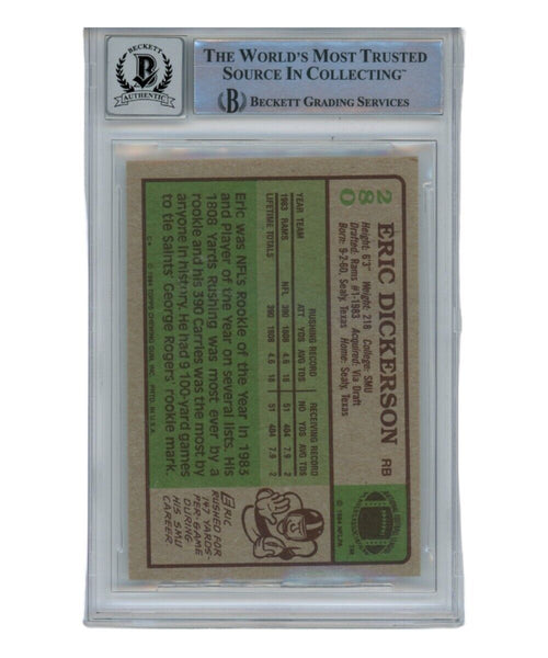 Eric Dickerson Signed 1984 Topps #280 Auto 10 Trading Card HOF Beckett 40345 The number in the listing title is just an inventory sku for our records and is not the authentication number. The item pictured is the exact item you will receive so see photos for condition. This is a slabbed 1984 Topps #280 Trading Card with a grade 10 auto that was personally autographed by Eric Dickerson with "HOF" inscription. Includes a certificate of authenticity from Beckett Authentication Services (BAS) and Denver Autographs.