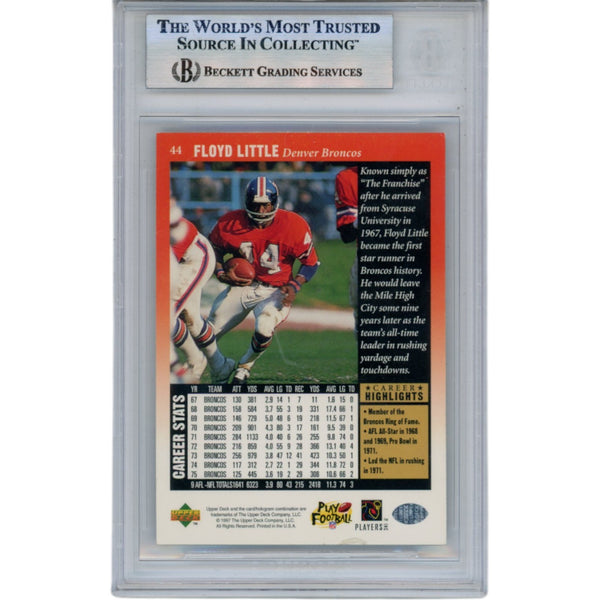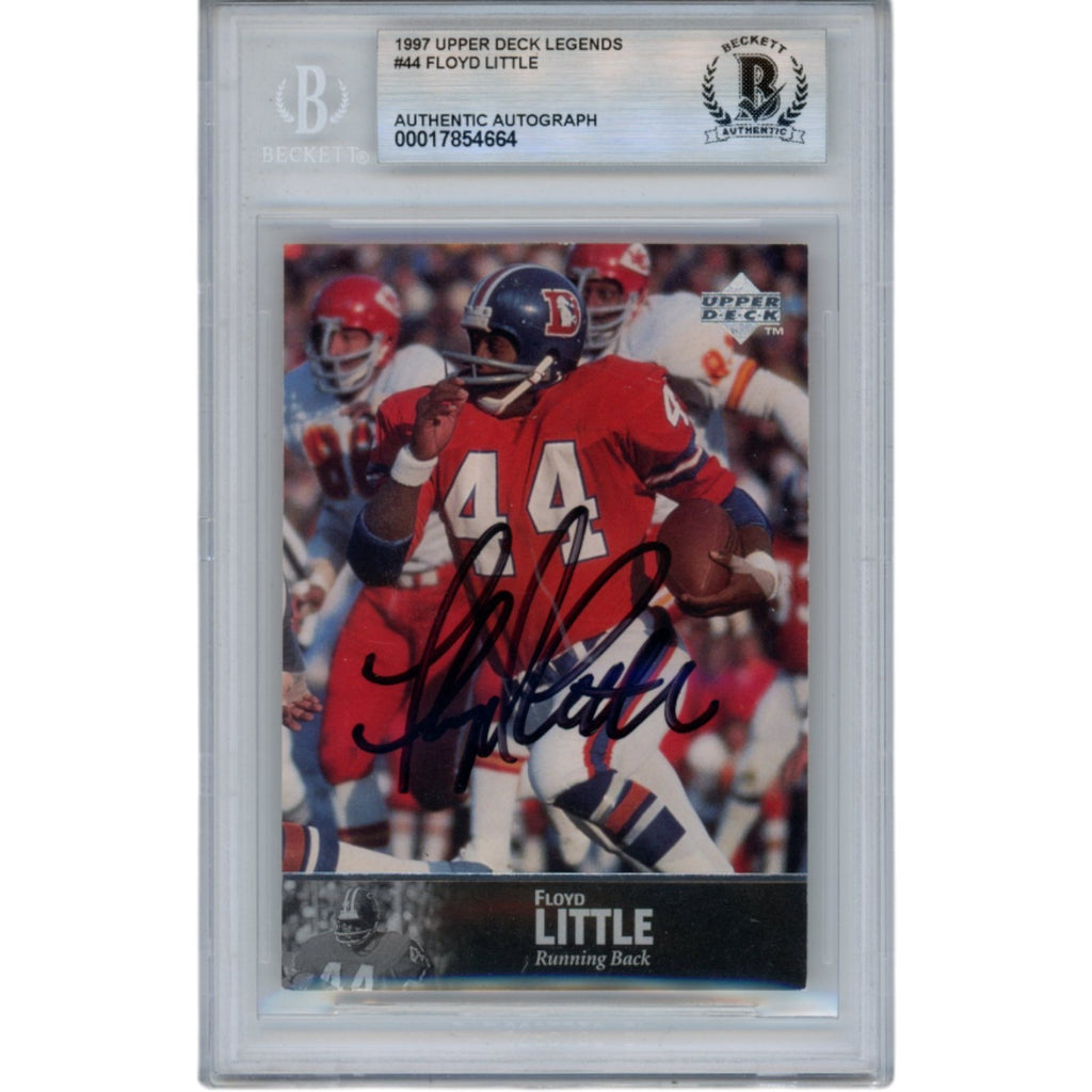 The number in the listing title is just an inventory sku for our records and is not the authentication number. The item pictured is the exact item you will receive, please see photos for condition. This is a Denver Broncos 1997 Upper Deck Legends #44 slabbed trading card that was personally autographed by Floyd Little. This item includes a certificate of authenticity from Beckett Grading Services and Denver Autographs.FREE SHIPPING within the USA on orders over $10!