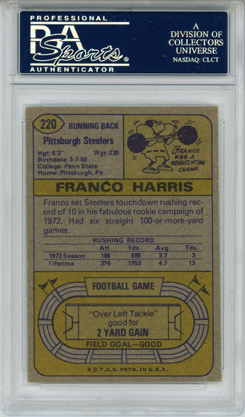 Franco Harris Autographed/Signed 1974 Topps #220 Trading Card PSA Slab 43691 The number in the listing title is just an inventory sku for our records and is not the authentication number. This is the exact item that you will receive so please see pictures for condition. This is a trading card that was personally autographed by Franco Harris. This has been professionally slabbed by Professional Authentication Services (PSA) and includes a certificate of authenticity from Denver Autographs.
