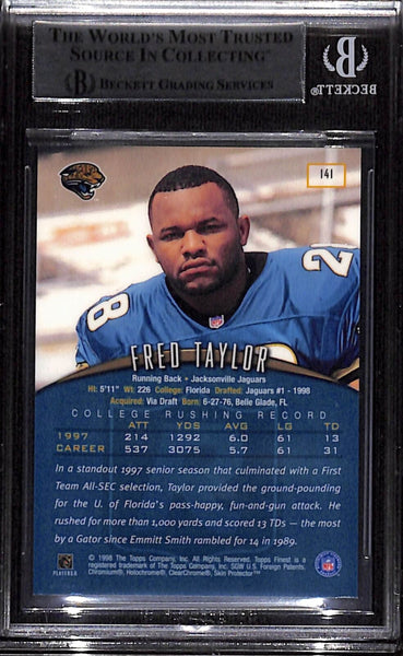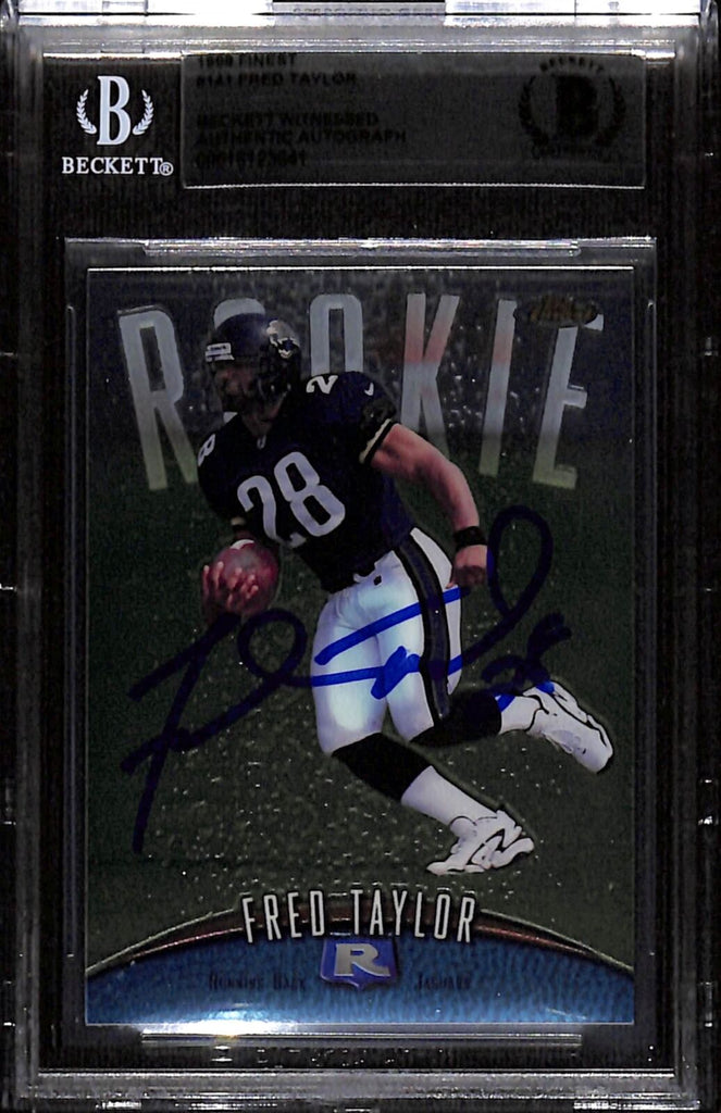 The number in the listing title is just an inventory sku for our records and is not the authentication number. The item pictured is a stock photo unless otherwise noted. This is a 1998 Topps Finest #141 slabbed trading card that was personally autographed by Fred Taylor. Includes a certificate of authenticity from Beckett Authentication Services (BAS) and Denver Autographs.