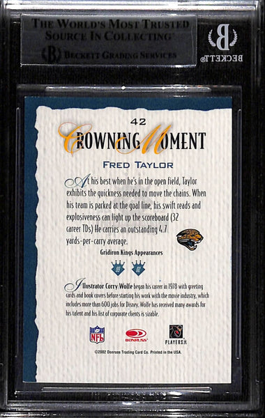 Fred Taylor Signed 2002 Gridiron Kings #42 Trading Card Beckett 43877 The number in the listing title is just an inventory sku for our records and is not the authentication number. The item pictured is a stock photo unless otherwise noted. This is a Jacksonville Jaguars 2002 Gridiron Kings #42 Slabbed Trading Card that was personally autographed by Fred Taylor. Includes a certificate of authenticity from Beckett Authentication Services (BAS) and Denver Autographs.