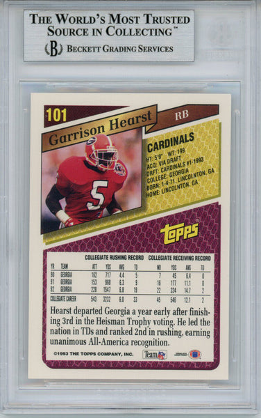 Garrison Hearst Autographed 1993 Topps #101 Rookie Card Beckett Slab 36306 The number in the listing title is just an inventory sku for our records and is not the authentication number. The item pictured is a stock photo unless otherwise noted. This is a trading card that was personally autographed by Garrison Hearst. This has been professionally slabbed by Beckett Authentication Services (BAS) and includes a certificate of authenticity from Denver Autographs.
