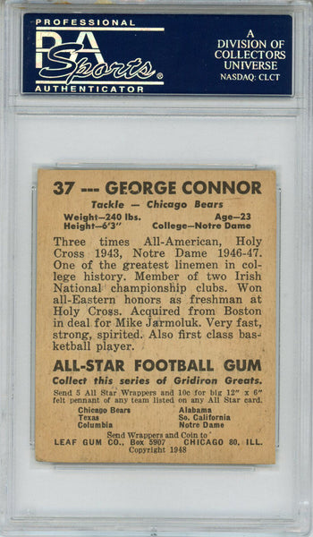 George Connor Autographed/Signed 1948 Leaf #37 Trading Card PSA Slab 43732 The number in the listing title is just an inventory sku for our records and is not the authentication number. This is the exact item that you will receive so please see pictures for condition. This is a trading card that was personally autographed by George Connor. This has been professionally slabbed by Professional Authentication Services (PSA) and includes a certificate of authenticity from Denver Autographs.