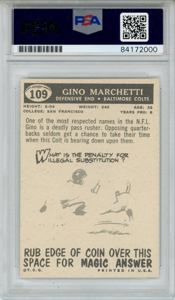 Gino Marchetti Autographed 1959 Topps #109 Trading Card PSA Slab 43625 The number in the listing title is just an inventory sku for our records and is not the authentication number. This is the exact item that you will receive so please see pictures for condition. This is a trading card that was personally autographed by Gino Marchetti. This has been professionally slabbed by Professional Authentication Services (PSA) and includes a certificate of authenticity from Denver Autographs.