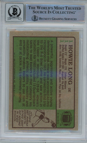 Howie Long Autographed 1984 Topps #111 Rookie Card w/HOF BAS 10 Slab 42941 The number in the listing title is just an inventory sku for our records and is not the authentication number. This is the exact item that you will receive so please see pictures for condition. This is a trading card that was personally autographed by Howie Long with HOF inscription. This has been professionally slabbed by Beckett Authentication Services (BAS) and includes a certificate of authenticity from Denver Autographs.