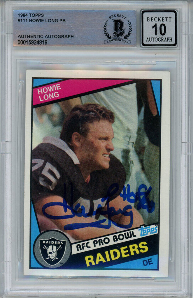 Howie Long Autographed 1984 Topps #111 Rookie Card w/HOF BAS 10 Slab 42954 The number in the listing title is just an inventory sku for our records and is not the authentication number. This is the exact item that you will receive so please see pictures for condition. This is a trading card that was personally autographed by Howie Long with HOF inscription. This has been professionally slabbed by Beckett Authentication Services (BAS) and includes a certificate of authenticity from Denver Autographs.