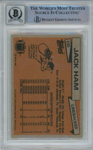 Jack Ham Signed Steelers 1981 Topps #235 w/HOF Beckett Auto 10 40688 The number in the listing title is just an inventory sku for our records and is not the authentication number. This is a 1981 Topps #235 trading card that was personally autographed by Jack Ham with "HOF" inscription. This was professionally authenticated and slabbed by Beckett Authentication Services (BAS), also includes a certificate of authenticity from Denver Autographs.