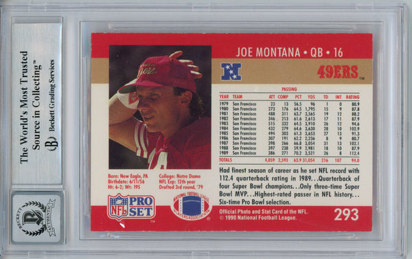 Joe Montana Autographed 1990 Pro Set #293 Trading Card BAS 10 Slab 34644 The number in the listing title is just an inventory sku for our records and is not the authentication number. The item pictured is a stock photo unless otherwise noted. This is a 1990 Pro Set trading card that was personally autographed by Joe Montana. This has been professionally slabbed by Beckett Authentication Services (BAS) and includes a certificate of authenticity from Denver Autographs.