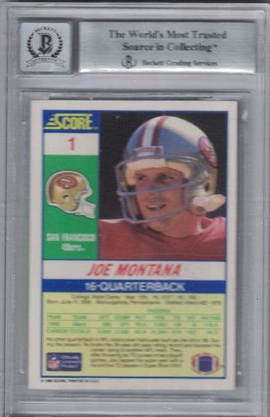 Joe Montana Autographed 1990 Score #1 Trading Card BAS 10 Slab 34627 The number in the listing title is just an inventory sku for our records and is not the authentication number. The item pictured is a stock photo unless otherwise noted. This is a 1990 Score trading card that was personally autographed by Joe Montana. This has been professionally slabbed by Beckett Authentication Services (BAS) and includes a certificate of authenticity from Denver Autographs.