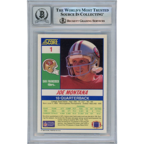 The number in the listing title is just an inventory sku for our records and is not the authentication number. This is a stock photo, unless otherwise noted. This is a San Francisco 49ers 1990 Score #1 Slabbed Trading Card that was personally autographed by Joe Montana. Includes a certificate of authenticity from Beckett Authentication Services (BAS) and Denver Autographs.FREE SHIPPING within the USA on orders over $10!