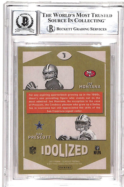 Joe Montana Dak Prescott Signed 2017 Classics Idolized 10 Auto BAS 39755 The number in the listing title is just an inventory sku for our records and is not the authentication number. The item pictured is a stock photo unless otherwise noted. This is a slabbed 2017 Classics Idolized Grade 10 Autograph Trading Card that was personally autographed by Dak Prescott and Joe Montana. Includes a certificate of authenticity from Beckett Authentication Services (BAS) and Denver Autographs.