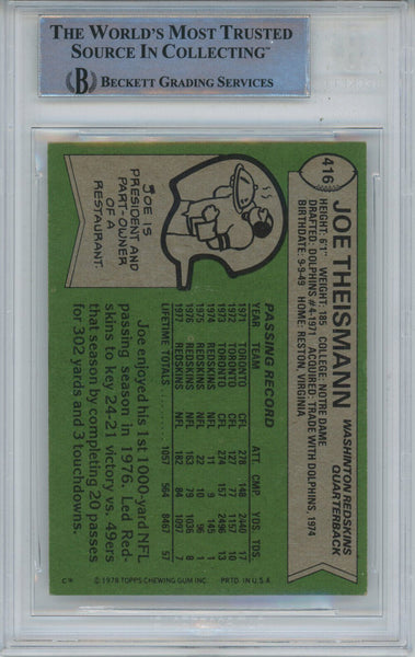 Joe Theismann Autographed 1978 Topps #416 Trading Card Beckett Slab 42907 The number in the listing title is just an inventory sku for our records and is not the authentication number. This is the exact item that you will receive so please see pictures for condition. This is a trading card that was personally autographed by Joe Theismann. This has been professionally slabbed by Beckett Authentication Services (BAS) and includes a certificate of authenticity from Denver Autographs.