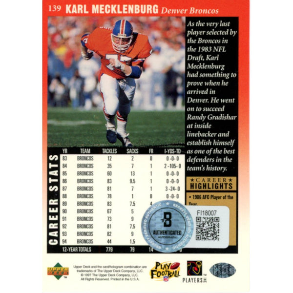 The number in the listing title is just an inventory sku for our records and is not the authentication number. The item pictured is the exact item you will receive, please see photos for condition. This is a Denver Broncos 1997 Upper Deck #139 Trading Card that was personally autographed by Karl Mecklenburg. Includes a certificate of authenticity from Beckett Authentication Services (BAS) and Denver Autographs. FREE SHIPPING within the USA on orders over $99!