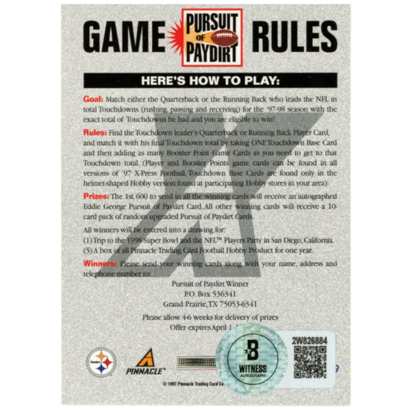 The number in the listing title is just an inventory sku for our records and is not the authentication number. The item pictured is the exact item you will receive, please see photos for condition. This is a Pittsburgh Steelers 1997 Pinnacle X-Press Pursuit of Pay Dirt Trading Card that was personally autographed by Kordell Stewart. Includes a certificate of authenticity from Beckett Authentication Services (BAS) and Denver Autographs. FREE SHIPPING within the USA on orders over $10!
