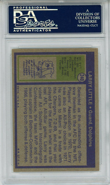 Larry Little Autographed 1972 Topps #240 Trading Card PSA Slab 43623 The number in the listing title is just an inventory sku for our records and is not the authentication number. This is the exact item that you will receive so please see pictures for condition. This is a trading card that was personally autographed by Larry Little. This has been professionally slabbed by Professional Authentication Services (PSA) and includes a certificate of authenticity from Denver Autographs.