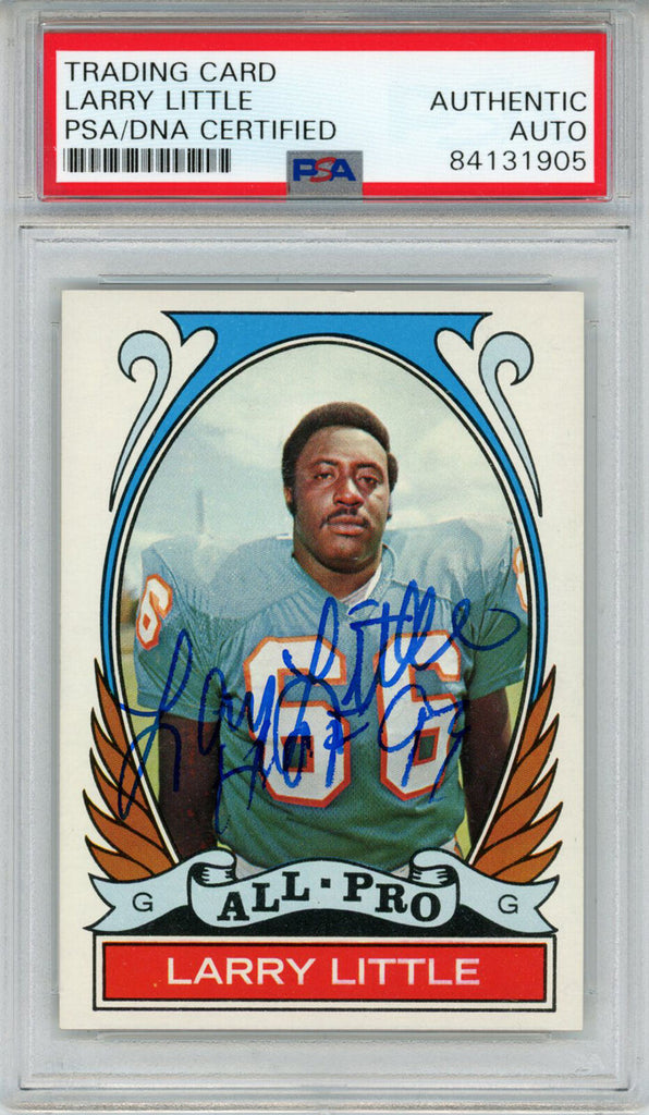 Larry Little Autographed 1972 Topps #267 Rookie Card HOF PSA Slab 43605 The number in the listing title is just an inventory sku for our records and is not the authentication number. This is the exact item that you will receive so please see pictures for condition. This is a trading card that was personally autographed by Larry Little with HOF inscription. This has been professionally slabbed by Professional Authentication Services (PSA) and includes a certificate of authenticity from Denver Autographs.