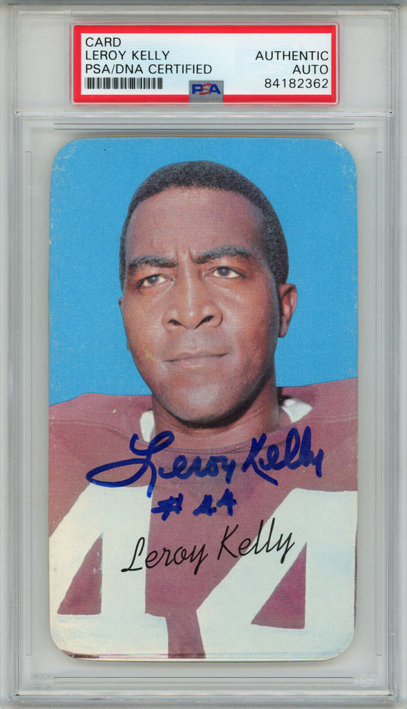 Leroy Kelly Autographed 1970 Topps Super #8 Trading Card PSA Slab 43824 The number in the listing title is just an inventory sku for our records and is not the authentication number. This is the exact item that you will receive so please see pictures for condition. This is a trading card that was personally autographed by Leroy Kelly. This has been professionally slabbed by Professional Authentication Services (PSA) and includes a certificate of authenticity from Denver Autographs.