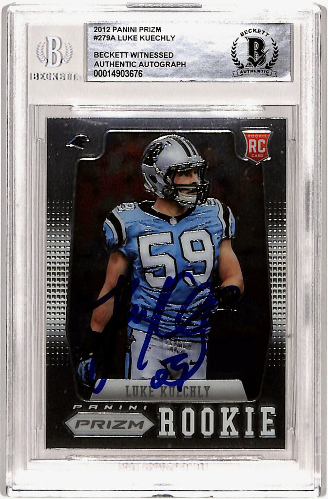 Luke Kuechly Autographed 2012 Panini Prizm #279 Rookie Card Beckett Slab 40741 The number in the listing title is just an inventory sku for our records and is not the authentication number. The item pictured is a stock photo unless otherwise noted. This is a trading card that was personally autographed by Luke Kuechly. This has been professional slabbed by Beckett Authentication Services (BAS) and includes a certificate of authenticity from Denver Autographs.