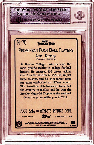 Luke Kuechly Signed 2012 Topps Turkey Red #75 Rookie Card Beckett Slab 40770 The number in the listing title is just an inventory sku for our records and is not the authentication number. The item pictured is a stock photo unless otherwise noted. This is a trading card that was personally autographed by Luke Kuechly. This has been professional slabbed by Beckett Authentication Services (BAS) and includes a certificate of authenticity from Denver Autographs.